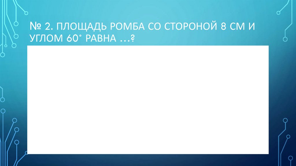 № 2. ПЛОЩАДЬ РОМБА СО СТОРОНОЙ 8 СМ ИУГЛОМ 60˚ РАВНА …?