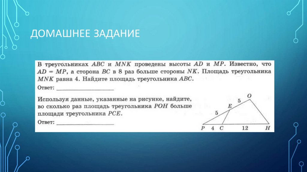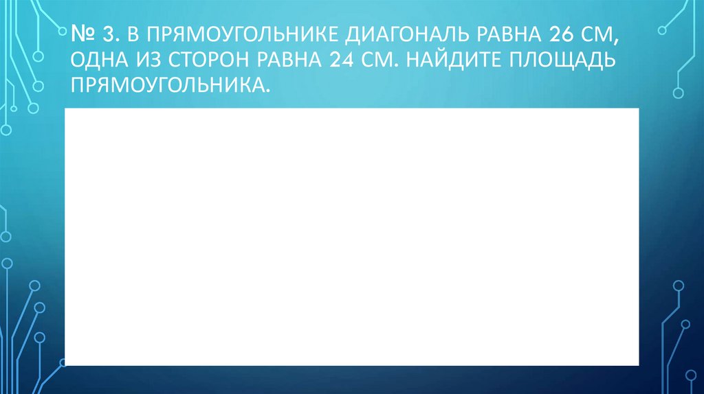 № 3. В ПРЯМОУГОЛЬНИКЕ ДИАГОНАЛЬ РАВНА 26 СМ,ОДНА ИЗ СТОРОН РАВНА 24 СМ. НАЙДИТЕ ПЛОЩАДЬ