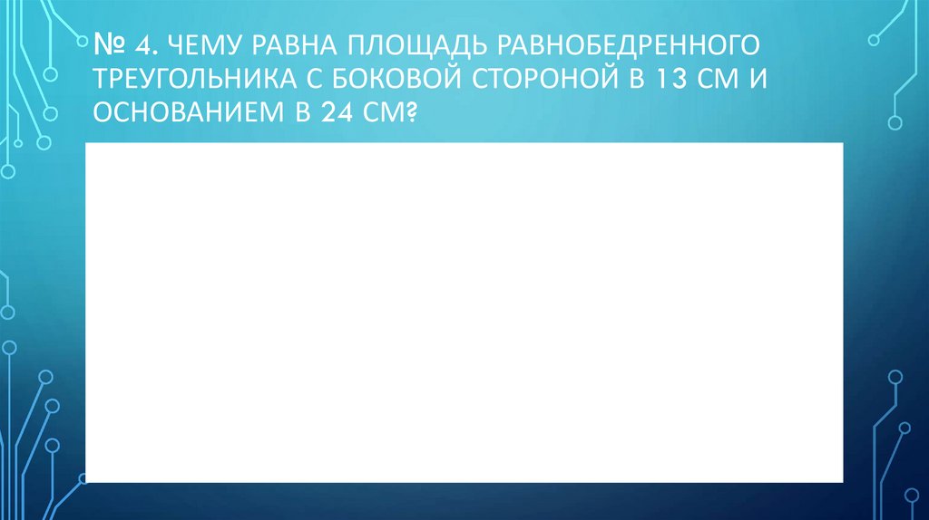 № 4. ЧЕМУ РАВНА ПЛОЩАДЬ РАВНОБЕДРЕННОГОТРЕУГОЛЬНИКА С БОКОВОЙ СТОРОНОЙ В 13 СМ И