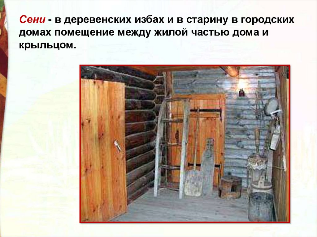 Сени - в деревенских избах и в старину в городскихдомах помещение между жилой частью дома и