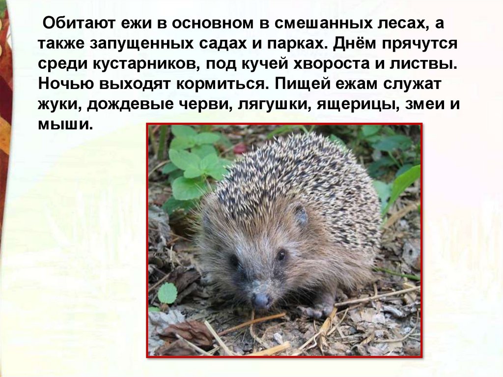 Обитают ежи в основном в смешанных лесах, атакже запущенных садах и парках. Днём прячутся