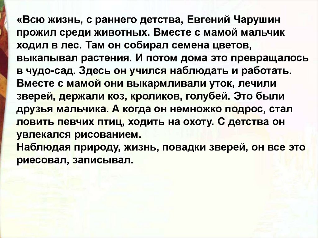 «Всю жизнь, с раннего детства, Евгений Чарушинпрожил среди животных. Вместе с мамой мальчик