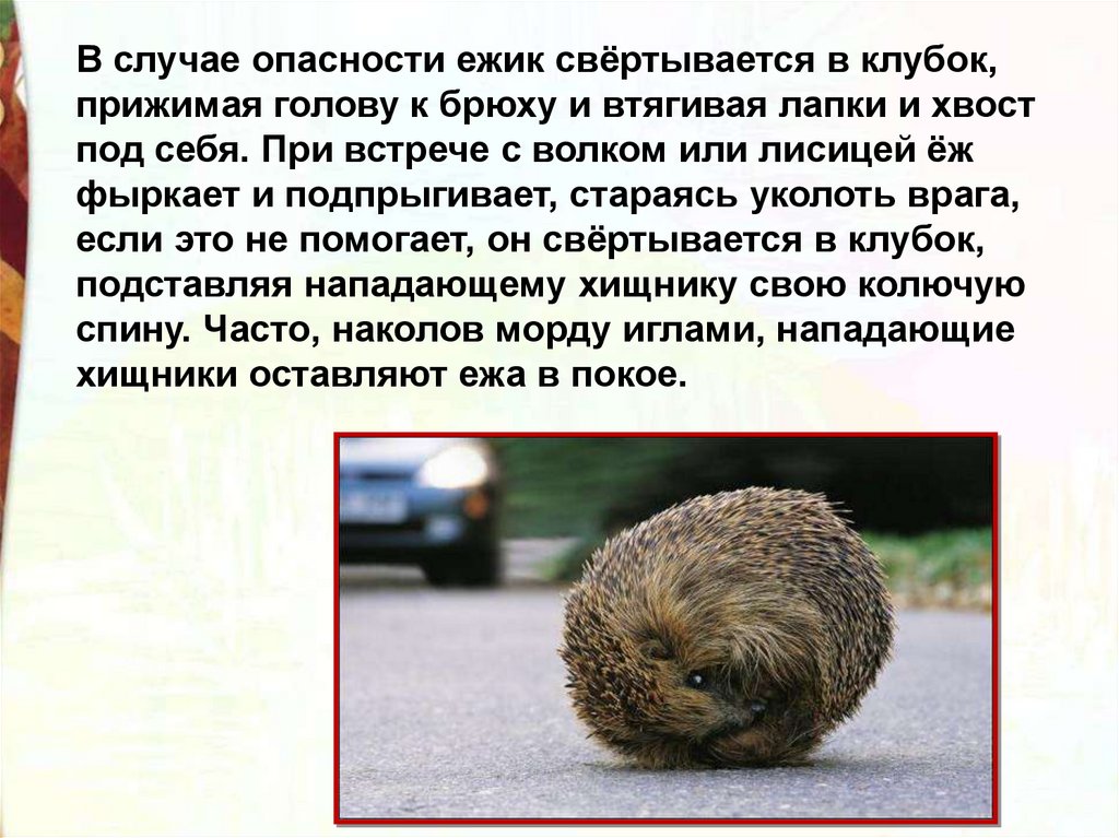 В случае опасности ежик свёртывается в клубок,прижимая голову к брюху и втягивая лапки и хвост