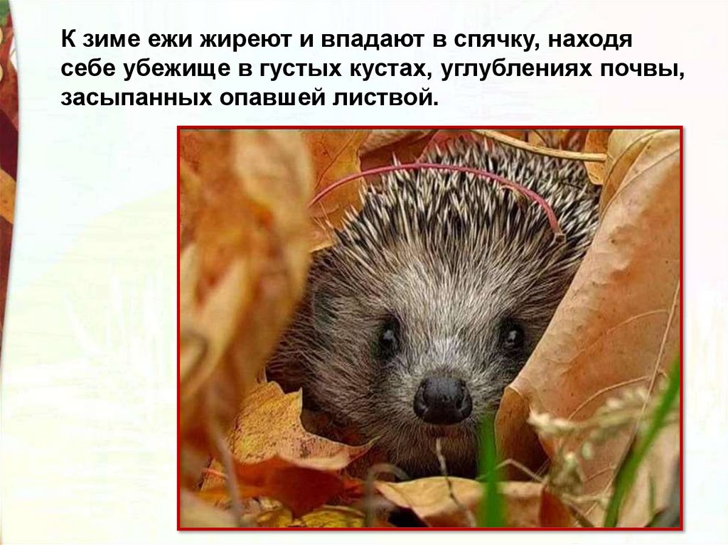 К зиме ежи жиреют и впадают в спячку, находясебе убежище в густых кустах, углублениях почвы,