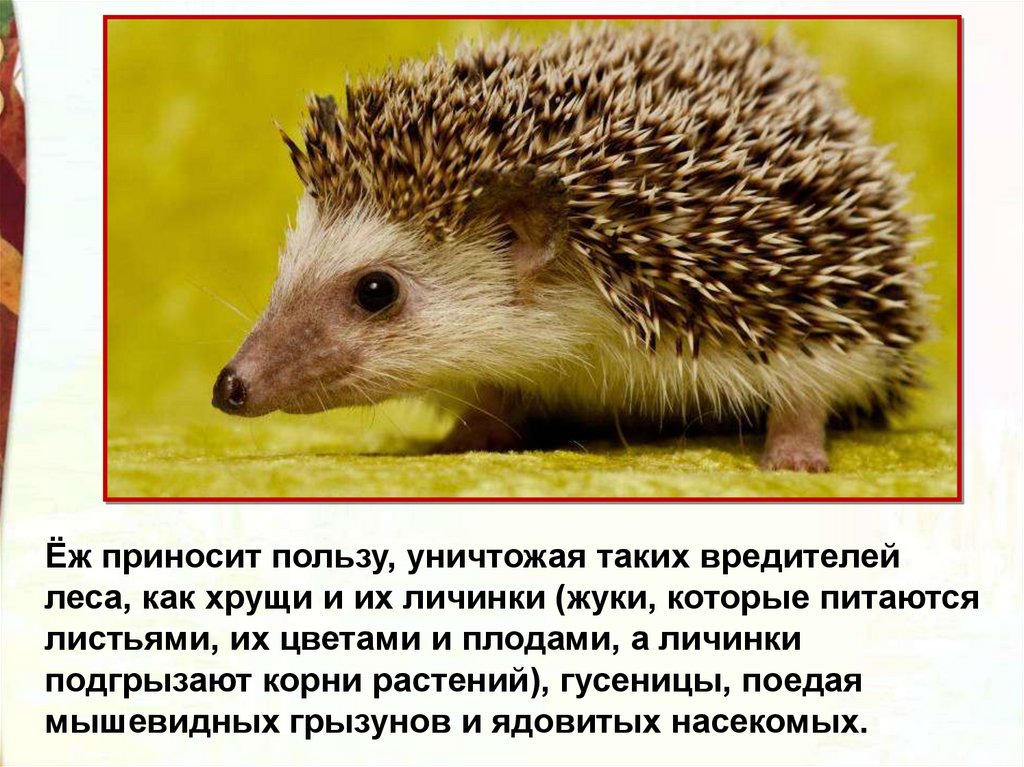 Ёж приносит пользу, уничтожая таких вредителейлеса, как хрущи и их личинки (жуки, которые питаются