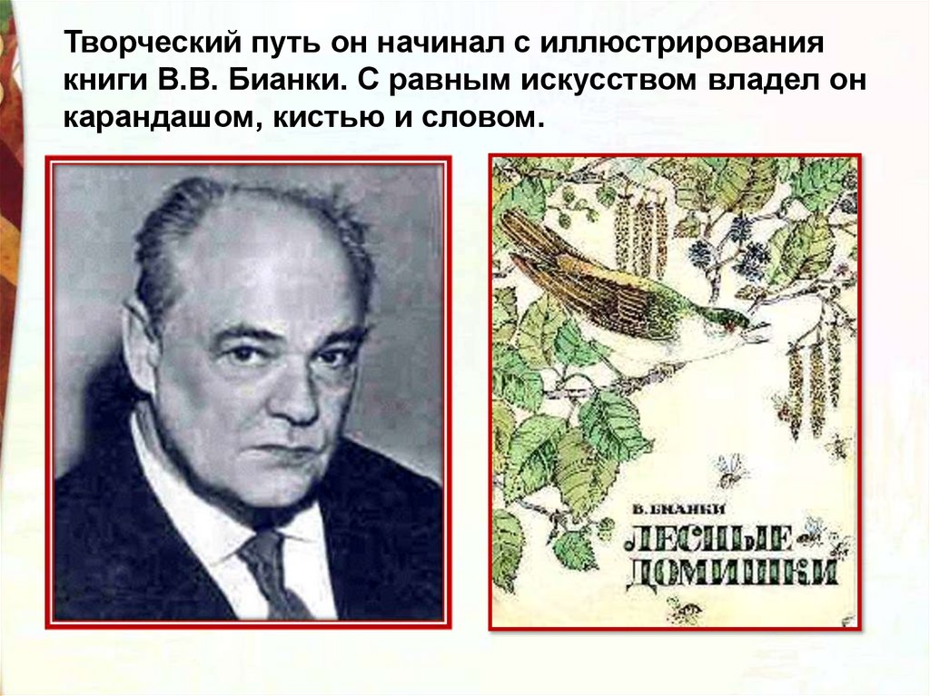 Творческий путь он начинал с иллюстрированиякниги В.В. Бианки. С равным искусством владел он