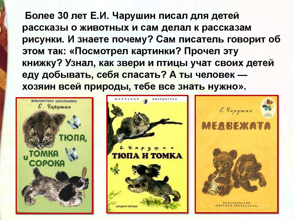 Более 30 лет Е.И. Чарушин писал для детейрассказы о животных и сам делал к рассказам