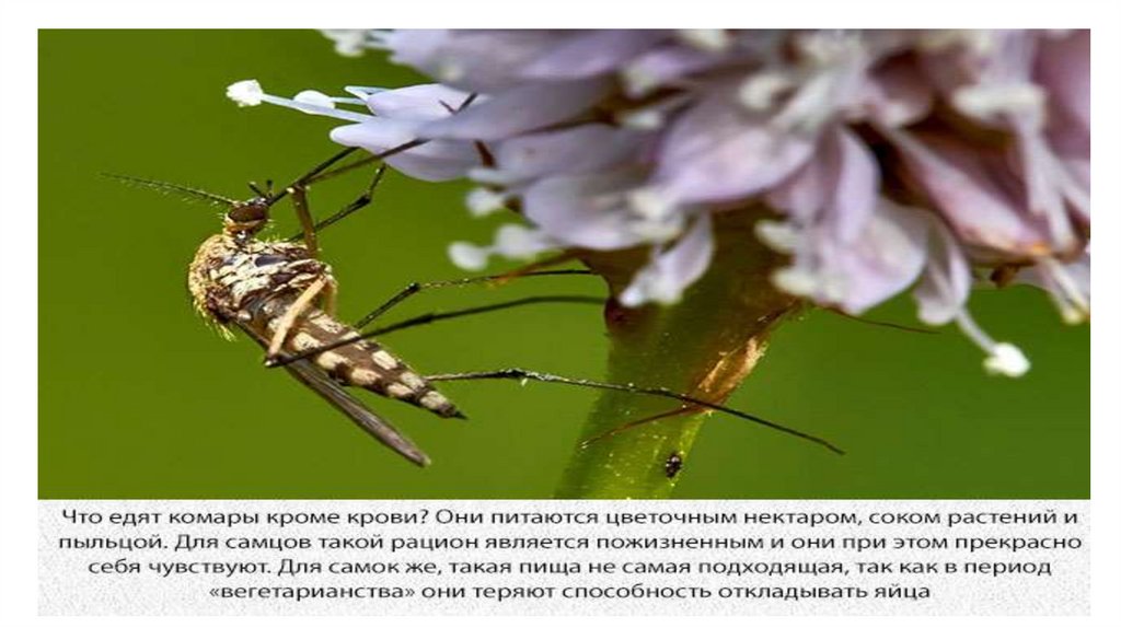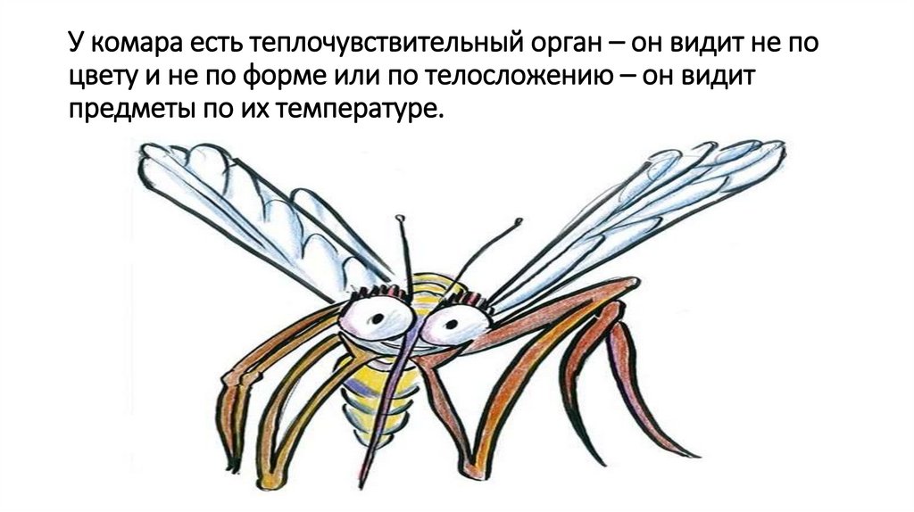 питаются они нектаром.7. У комара есть теплочувствительный орган – он видит не по цвету и не по форме или по телосложению – он видит предметы по их