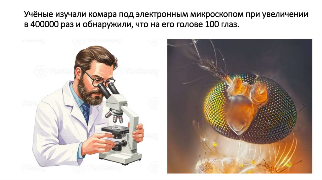 3. Учёные изучали комара под электронным микроскопом при увеличении в 400000 раз и обнаружили, что на его голове 100 глаз.