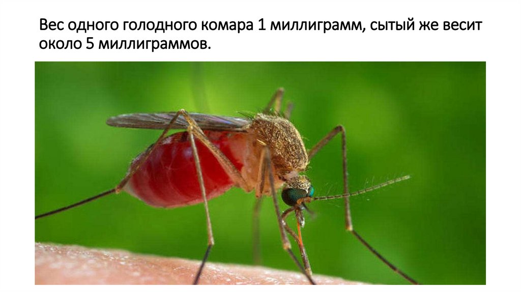 4. Вес одного голодного комара 1 миллиграмм, сытый же весит около 5 миллиграммов.