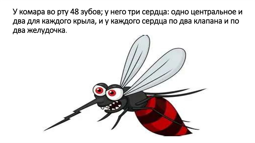 5. У комара во рту 48 зубов; у него три сердца: одно центральное и два для каждого крыла, и у каждого сердца по два клапана и по