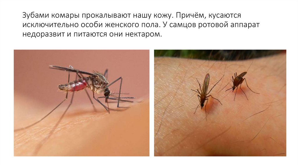 два желудочка.6. Зубами комары прокалывают нашу кожу. Причём, кусаются исключительно особи женского пола. У самцов ротовой аппарат недоразвит и