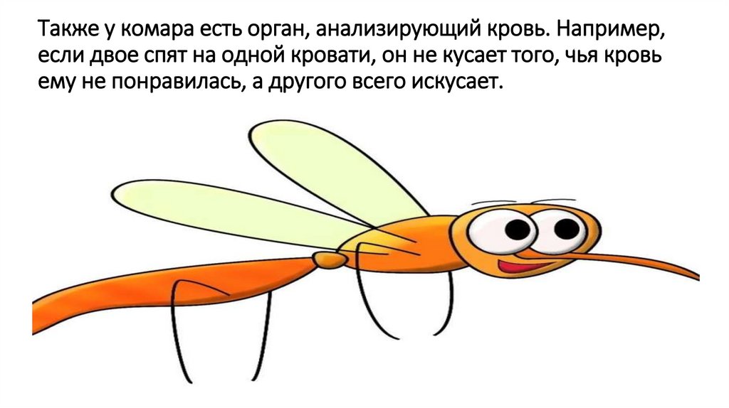 ничего, кроме этого человека.9. Также у комара есть орган, анализирующий кровь. Например, если двое спят на одной кровати, он не кусает того, чья кровь ему не