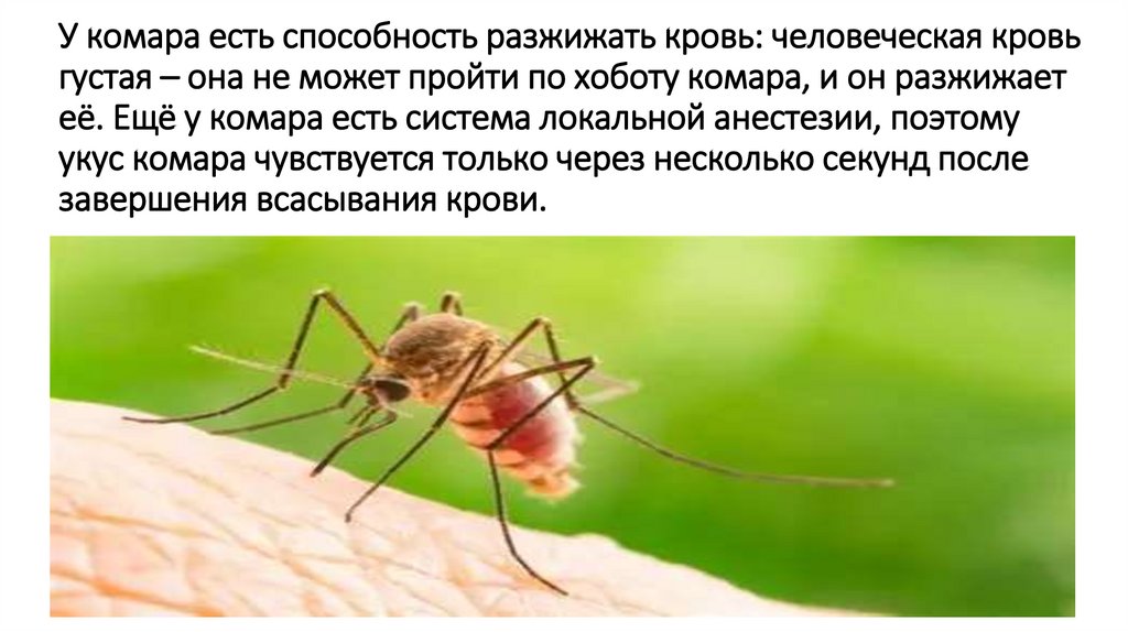 понравилась, а другого всего искусает.10. У комара есть способность разжижать кровь: человеческая кровь густая – она не может пройти по хоботу комара, и он разжижает её.