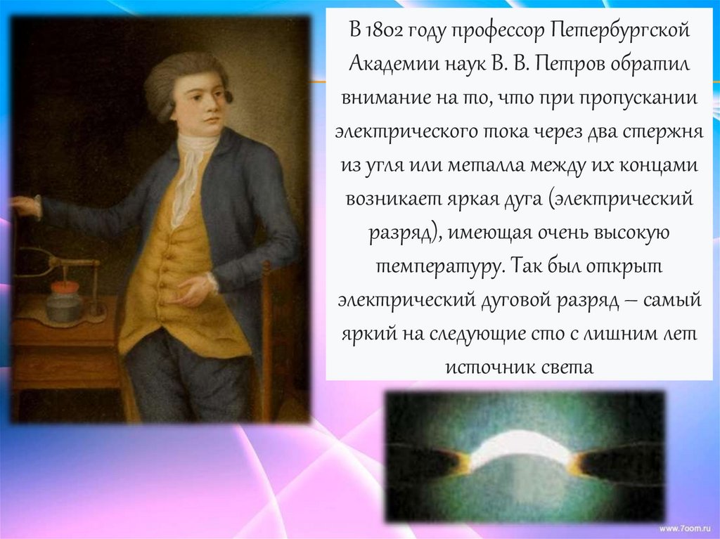 В 1802 году профессор ПетербургскойАкадемии наук В. В. Петров обратил