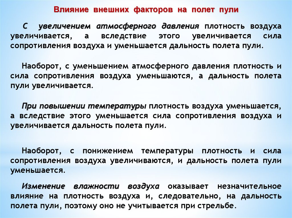 Влияние внешних факторов на полет пулиС увеличением атмосферного давления плотность воздуха