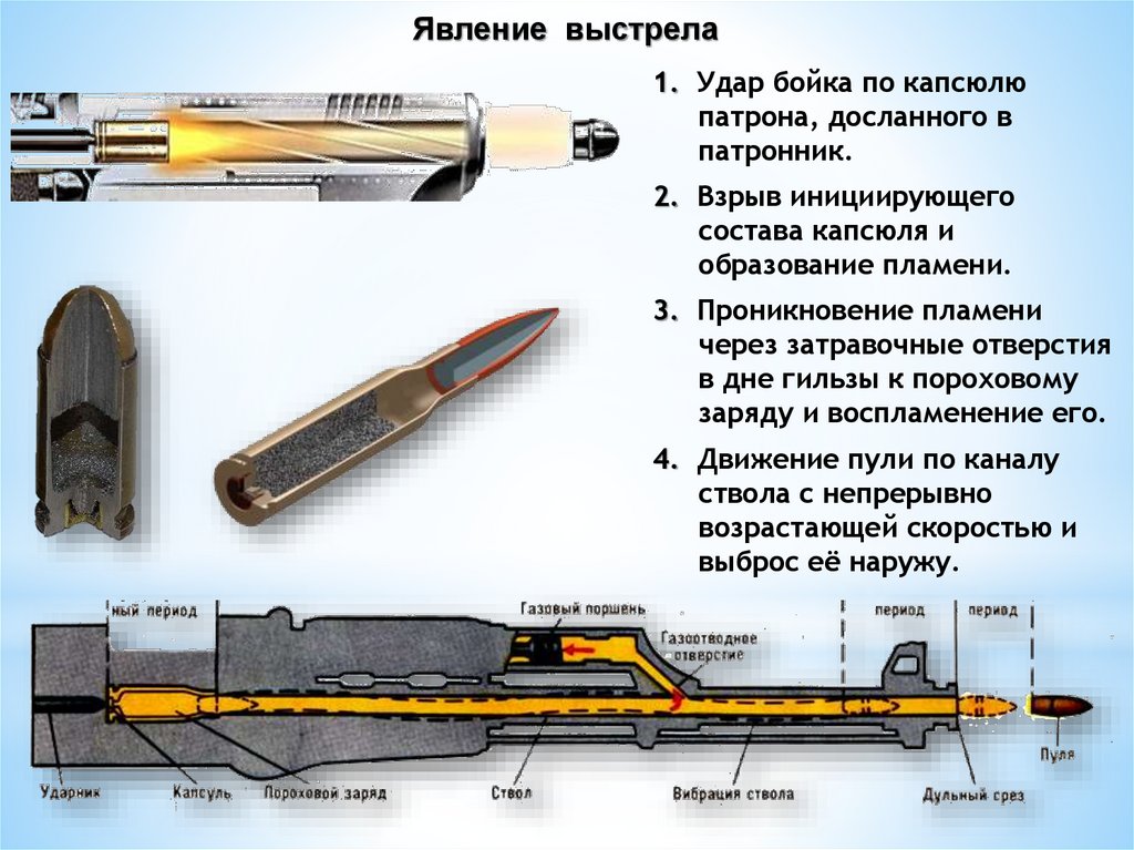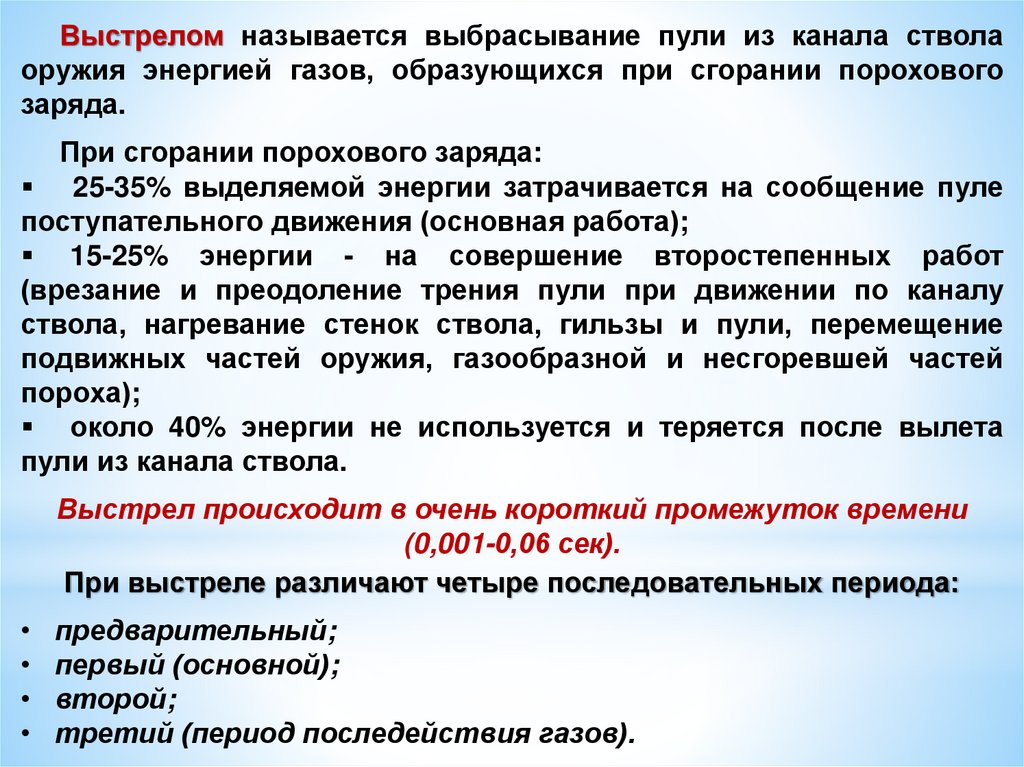 Выстрелом называется выбрасывание пули из канала стволаоружия энергией газов, образующихся при сгорании порохового