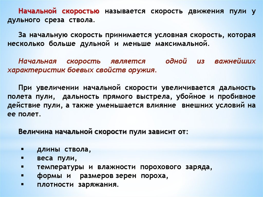 Начальной скоростью называется скорость движения пули удульного среза ствола.