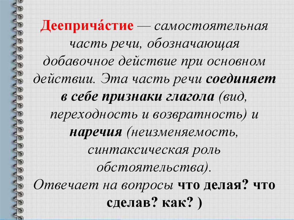Дееприча́стие — самостоятельнаячасть речи, обозначающая