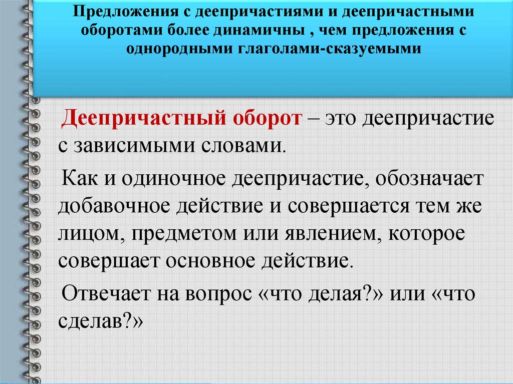 Предложения с деепричастиями и деепричастнымиоборотами более динамичны , чем предложения с