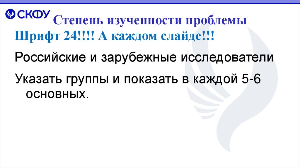 Шрифт 24!!!! А каждом слайде!!!5. Степень изученности проблемы