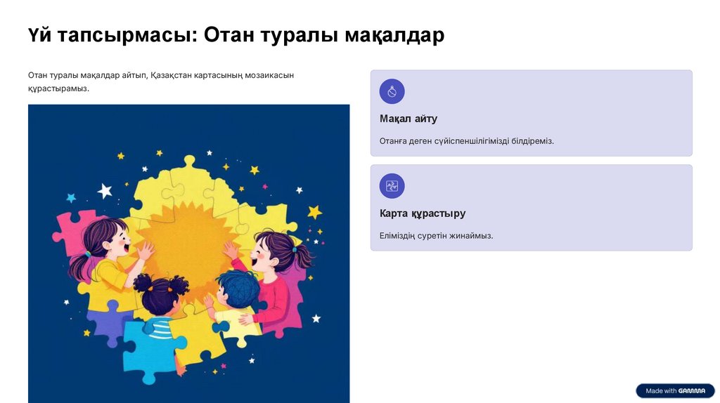 Үй тапсырмасы: Отан туралы мақалдарОтан туралы мақалдар айтып, Қазақстан картасының мозаикасын