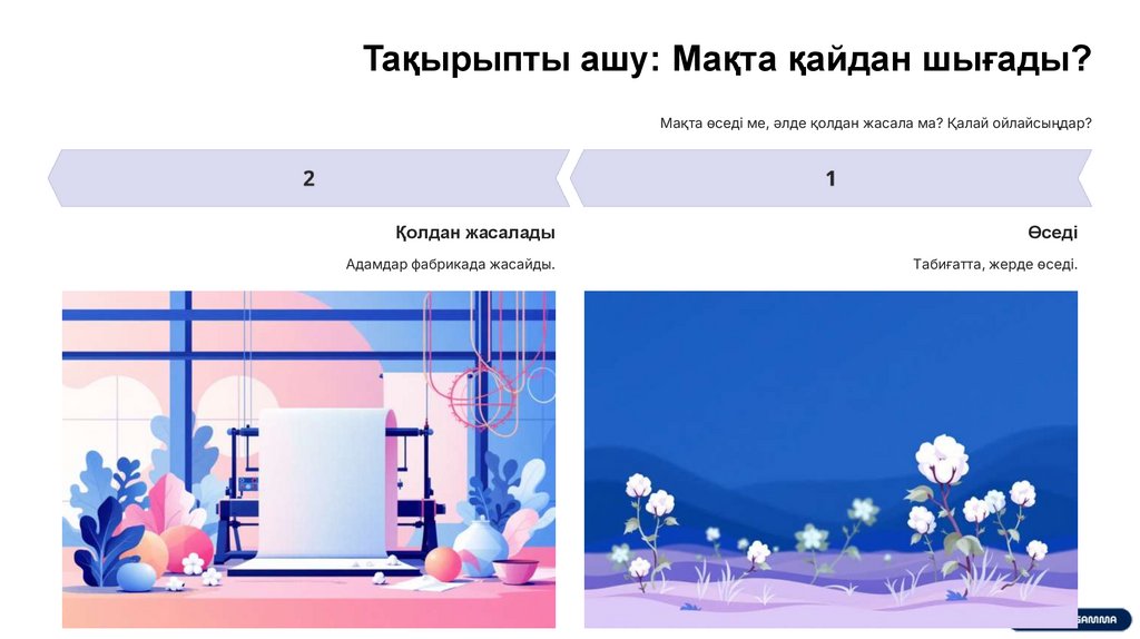 Тақырыпты ашу: Мақта қайдан шығады?Мақта өседі ме, әлде қолдан жасала ма? Қалай ойлайсыңдар?