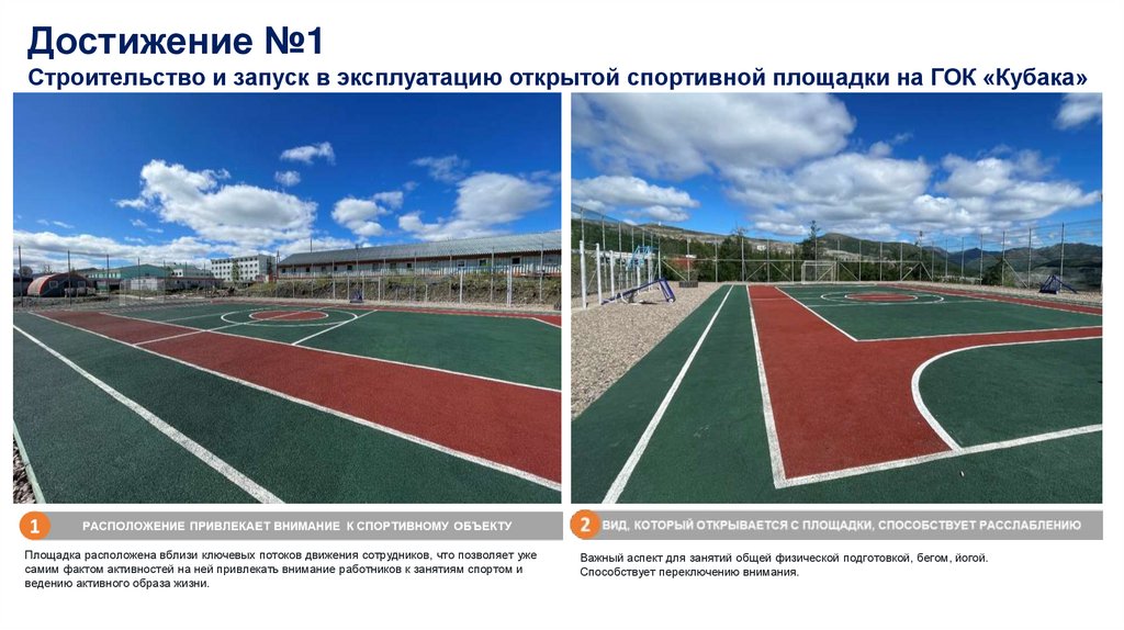 ООО «Омолонская золоторудная компания»2. Достижение №1 Строительство и запуск в эксплуатацию открытой спортивной площадки на ГОК «Кубака»
