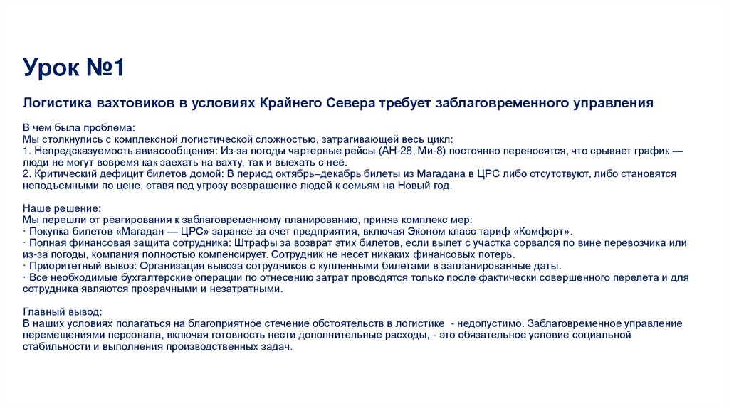 5. Урок №1 Логистика вахтовиков в условиях Крайнего Севера требует заблаговременного управления В чем была проблема: Мы