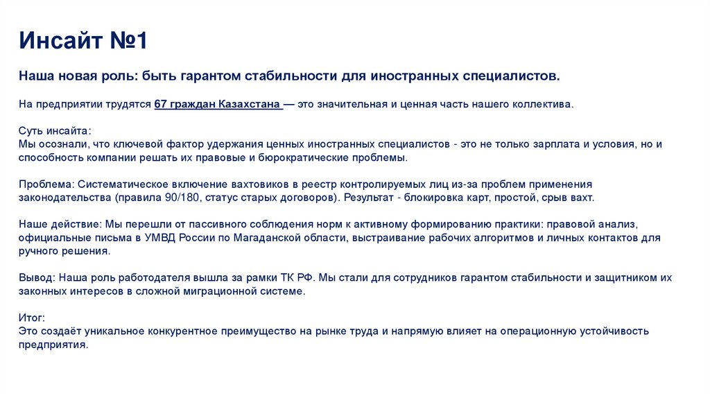 8. Инсайт №1 Наша новая роль: быть гарантом стабильности для иностранных специалистов. На предприятии трудятся 67 граждан