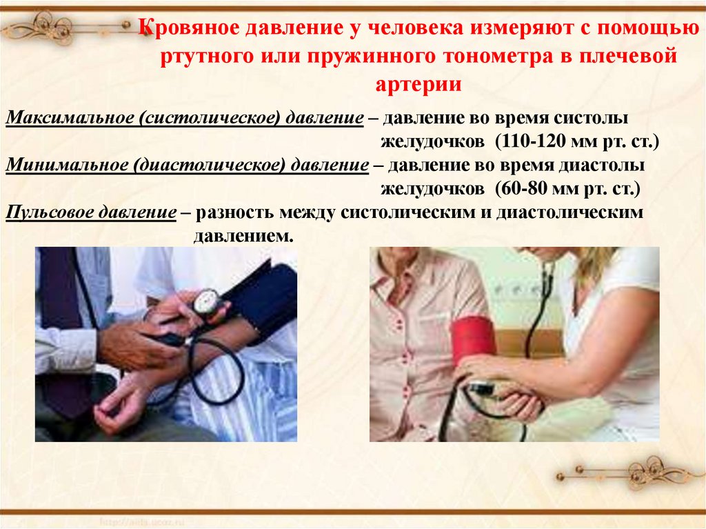 Кровяное давление у человека измеряют с помощьюртутного или пружинного тонометра в плечевой