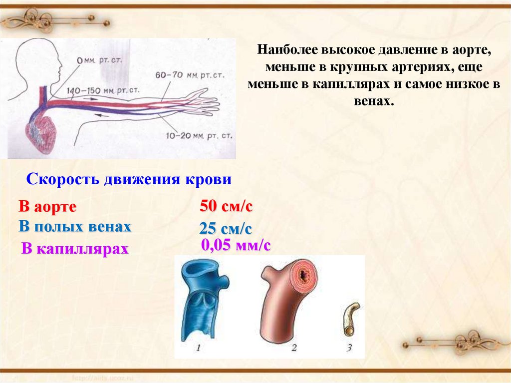 Наиболее высокое давление в аорте,меньше в крупных артериях, еще
