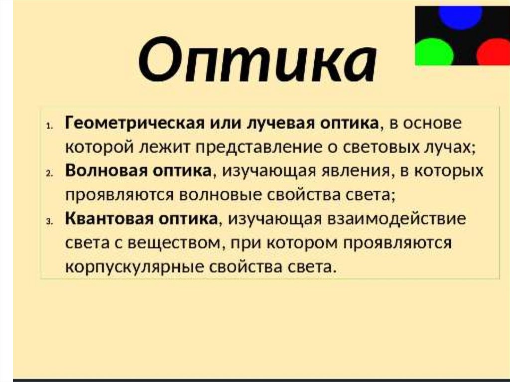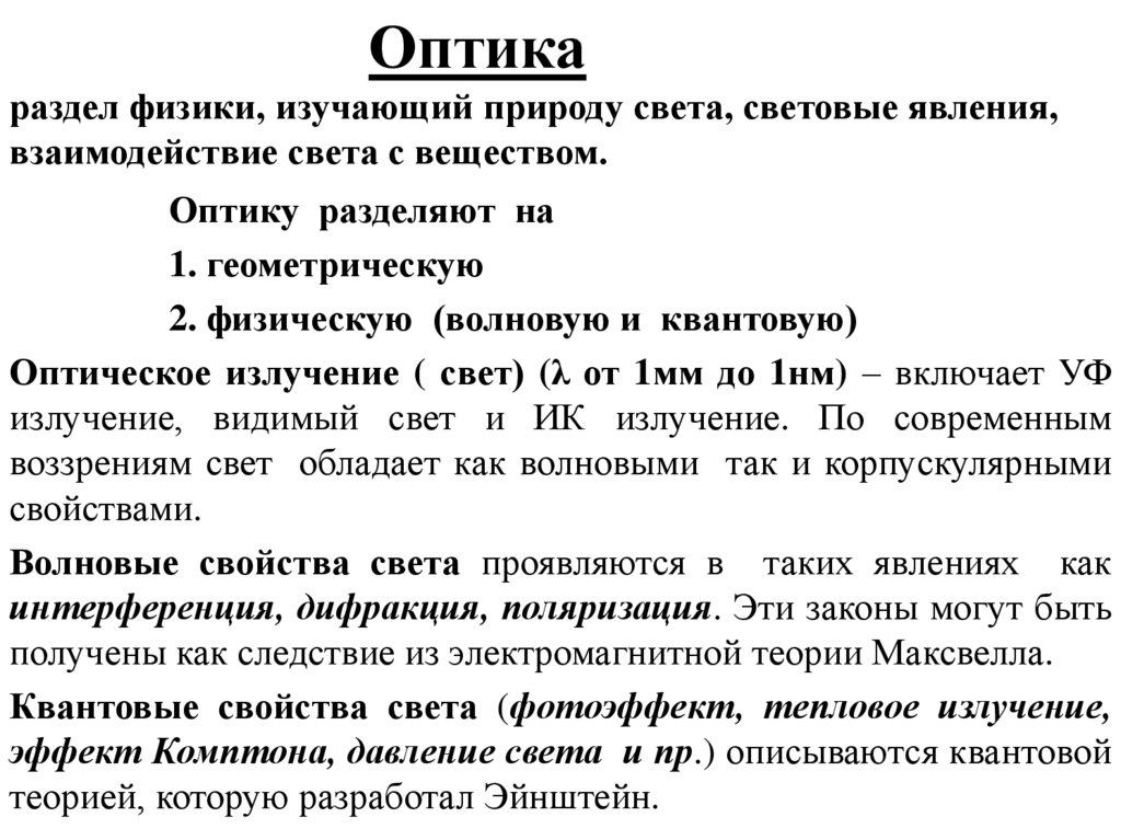 2. Оптика раздел физики, изучающий природу света, световые явления, взаимодействие света с веществом.