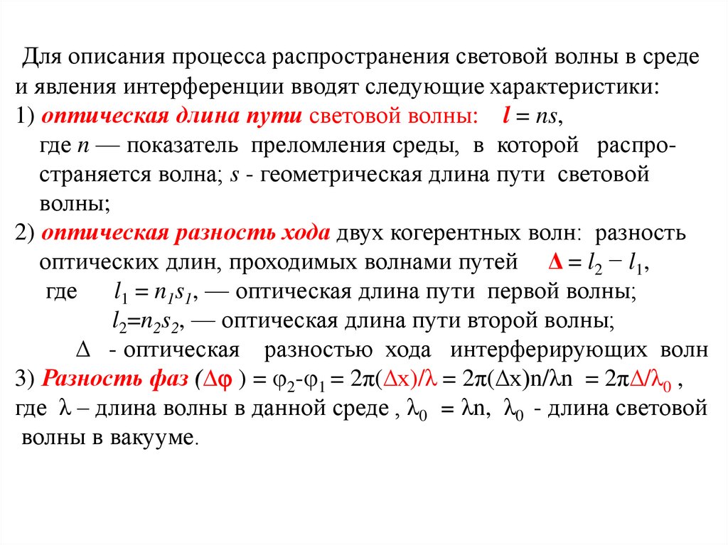 Для описания процесса распространения световой волны в средеи явления интерференции вводят следующие характеристики: