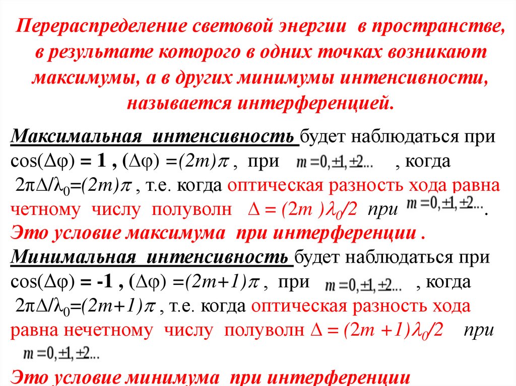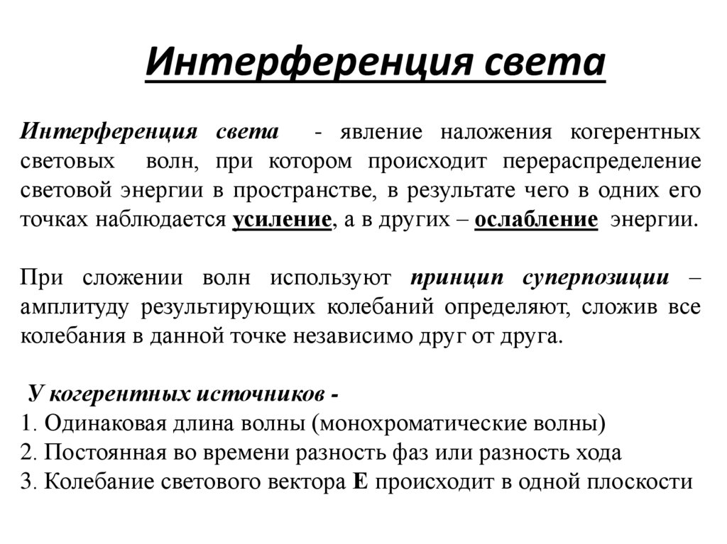 Интерференция света - явление наложения когерентныхсветовых волн, при котором происходит перераспределение