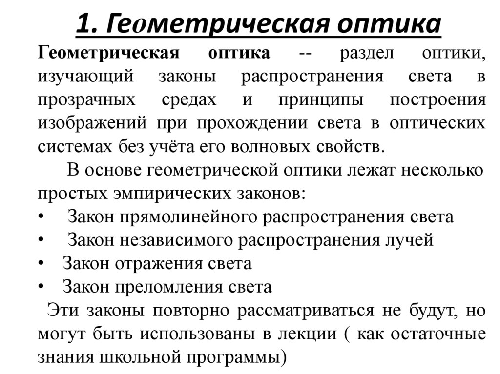Геометрическая оптика -- раздел оптики,изучающий законы распространения света в
