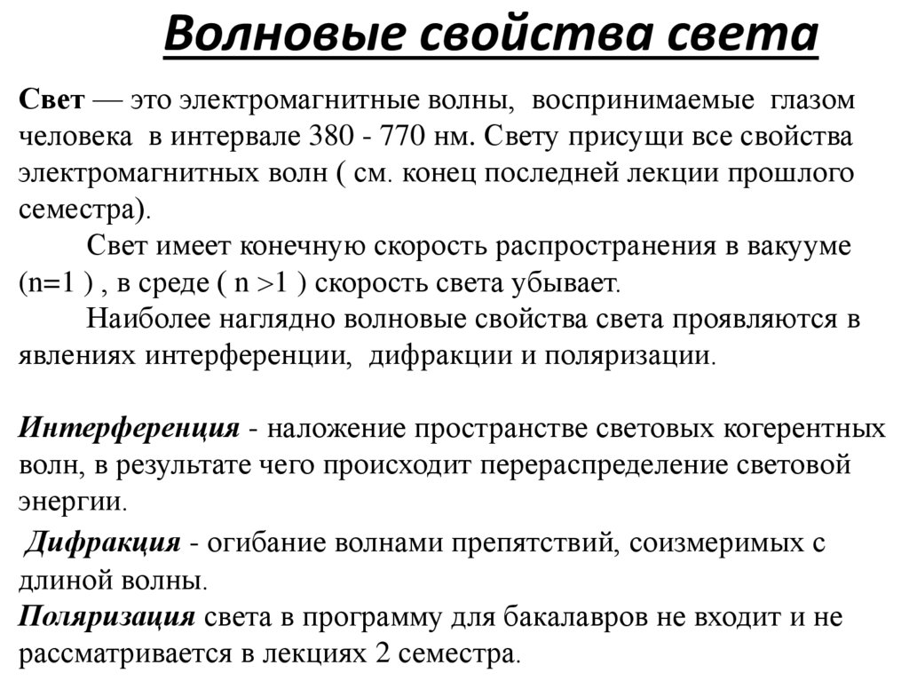 Свет — это электромагнитные волны, воспринимаемые глазомчеловека в интервале 380 - 770 нм. Свету присущи все свойства