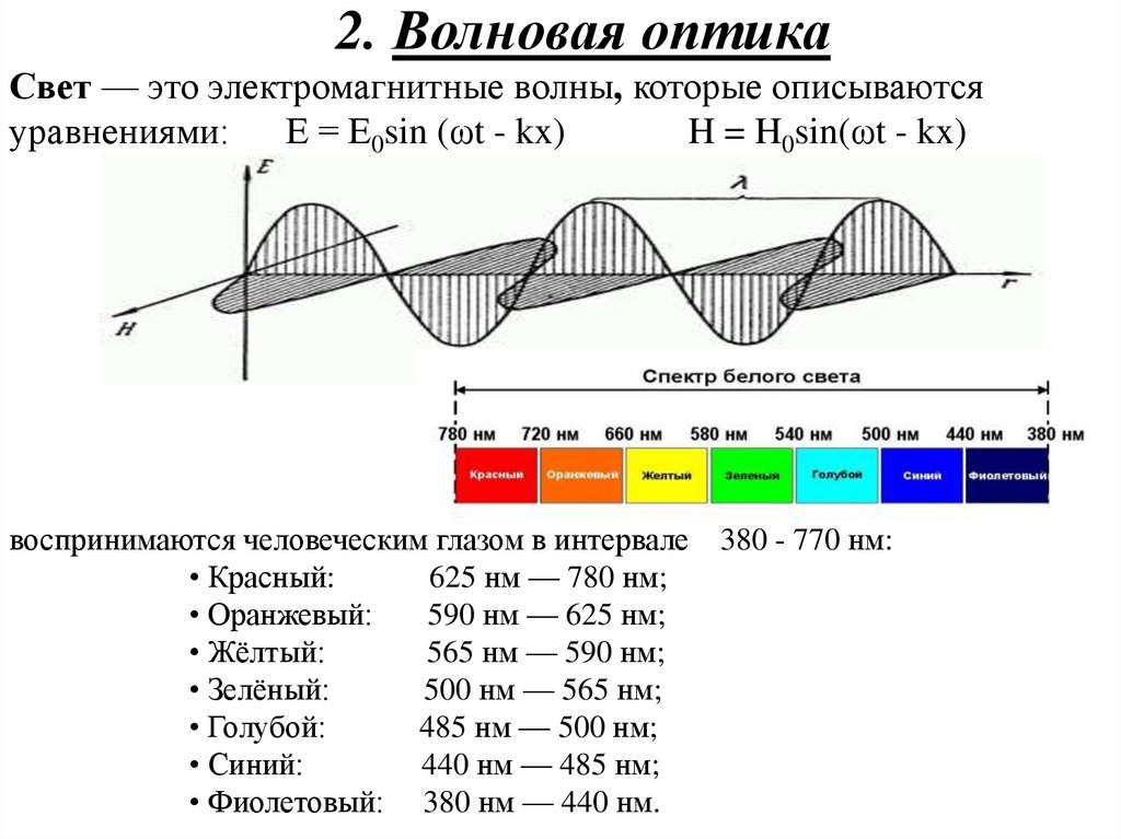 Свет — это электромагнитные волны, которые описываютсяуравнениями: Е = Е0sin (ωt - kx)
