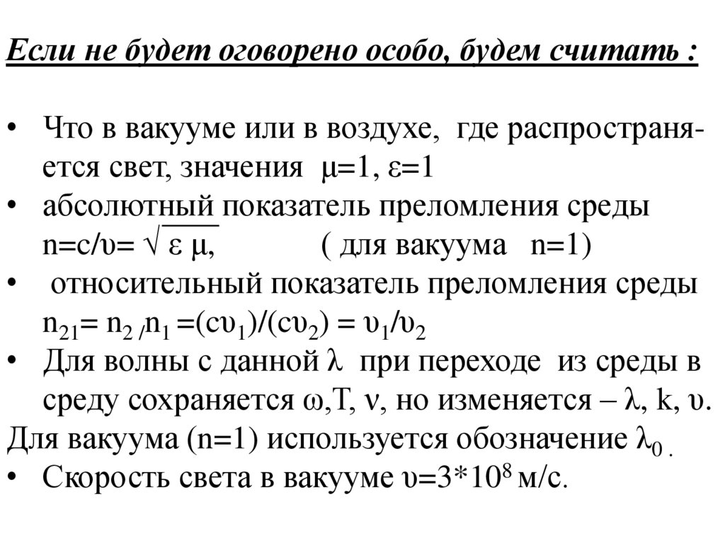 Если не будет оговорено особо, будем считать :• Что в вакууме или в воздухе, где распространяется свет, значения μ=1, ε=1
