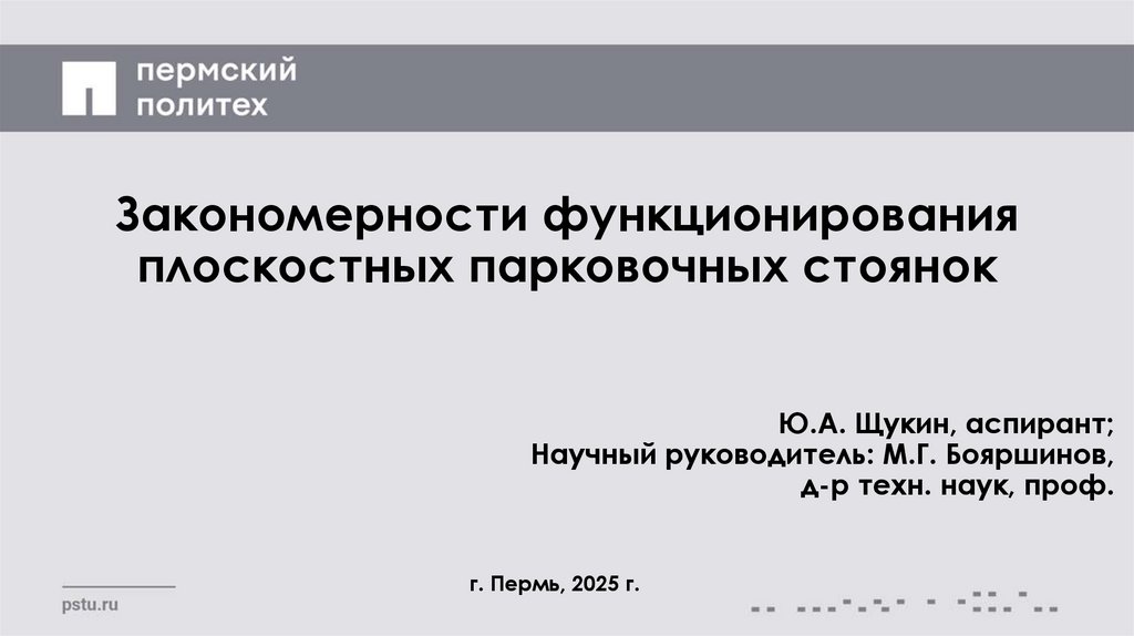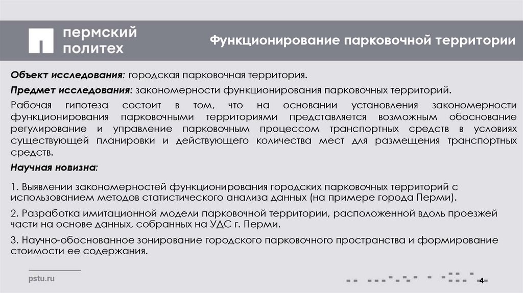 Объект исследования: городская парковочная территория.Предмет исследования: закономерности функционирования парковочных территорий.