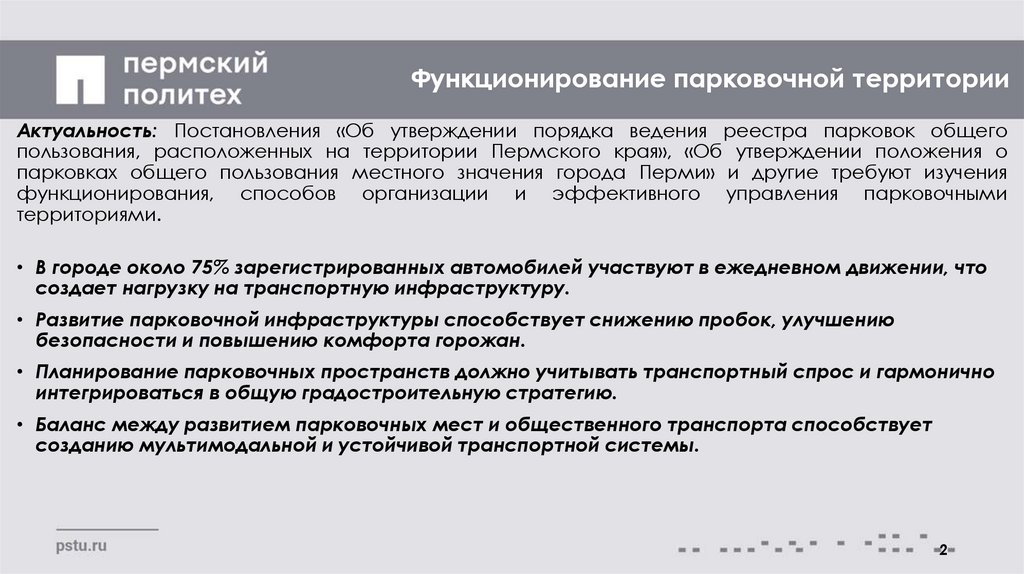 Актуальность: Постановления «Об утверждении порядка ведения реестра парковок общегопользования, расположенных на территории Пермского края», «Об утверждении положения о