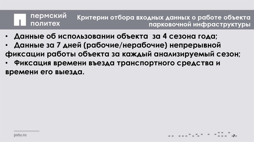 7. Критерии отбора входных данных о работе объекта парковочной инфраструктуры