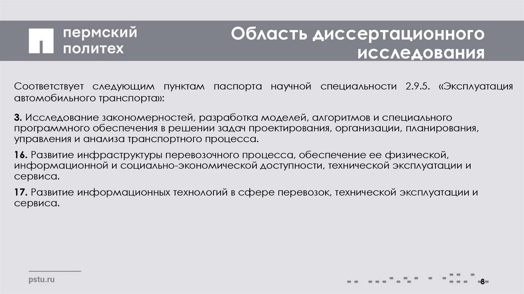 Соответствует следующим пунктам паспорта научной специальности 2.9.5. «Эксплуатацияавтомобильного транспорта»: