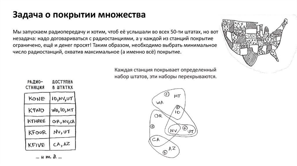 Задача о покрытии множестваМы запускаем радиопередачу и хотим, чтоб её услышали во всех 50-ти штатах, но вот