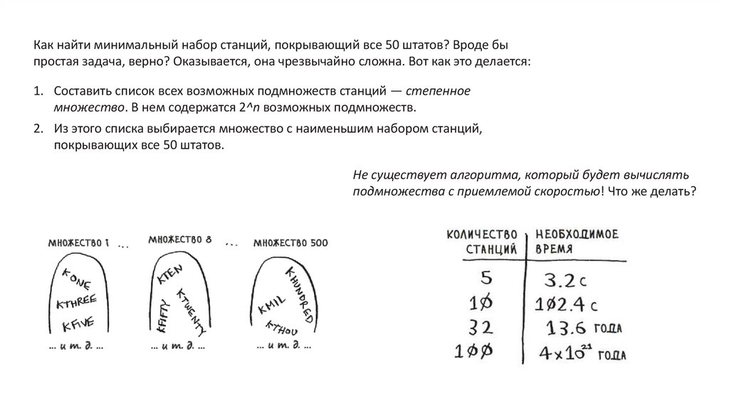 Как найти минимальный набор станций, покрывающий все 50 штатов? Вроде быпростая задача, верно? Оказывается, она чрезвычайно сложна. Вот как это делается:
