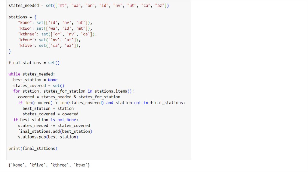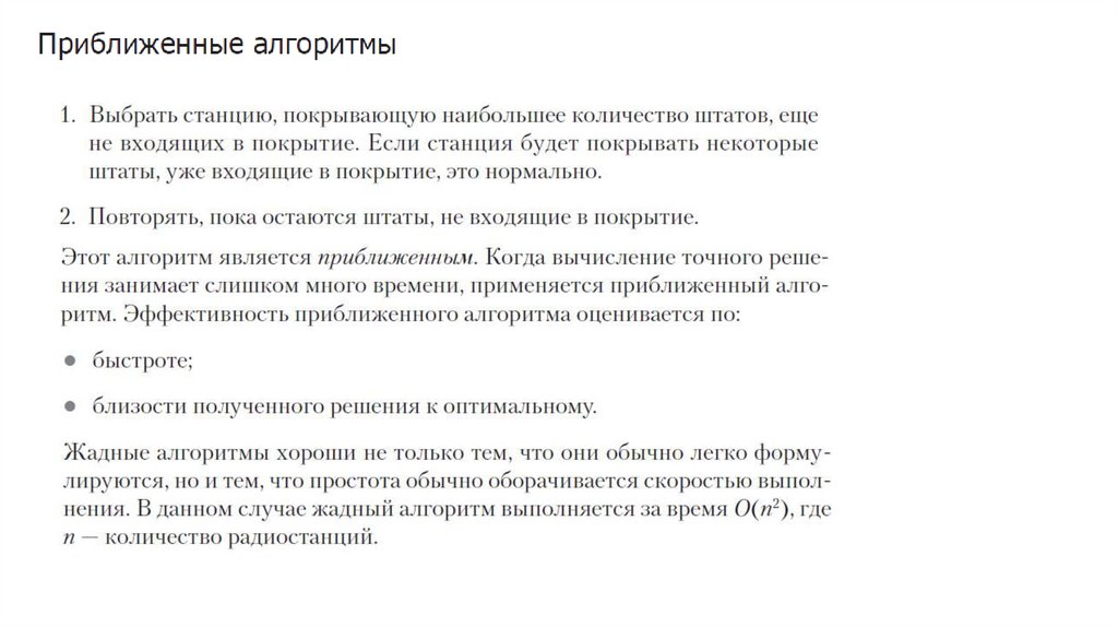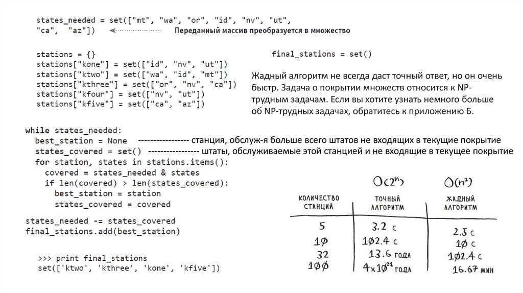 Жадный алгоритм не всегда даст точный ответ, но он оченьбыстр. Задача о покрытии множеств относится к NPтрудным задачам. Если вы хотите узнать немного больше