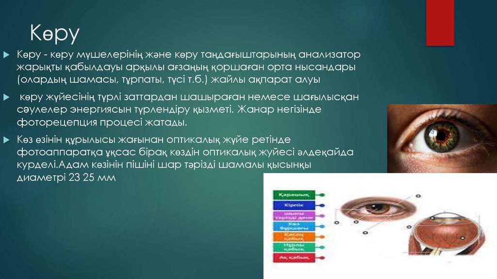 Көру - көру мүшелерінің және көру таңдағыштарының анализаторжарықты қабылдауы арқылы ағзаңың қоршаған орта нысандары