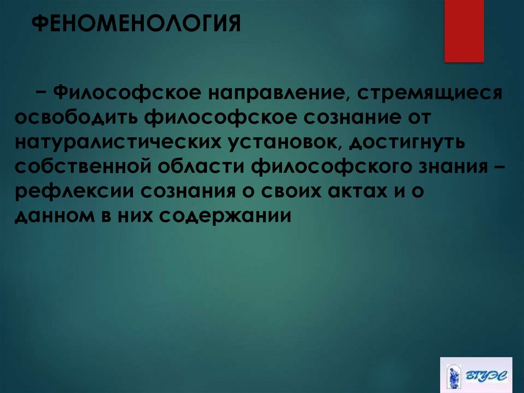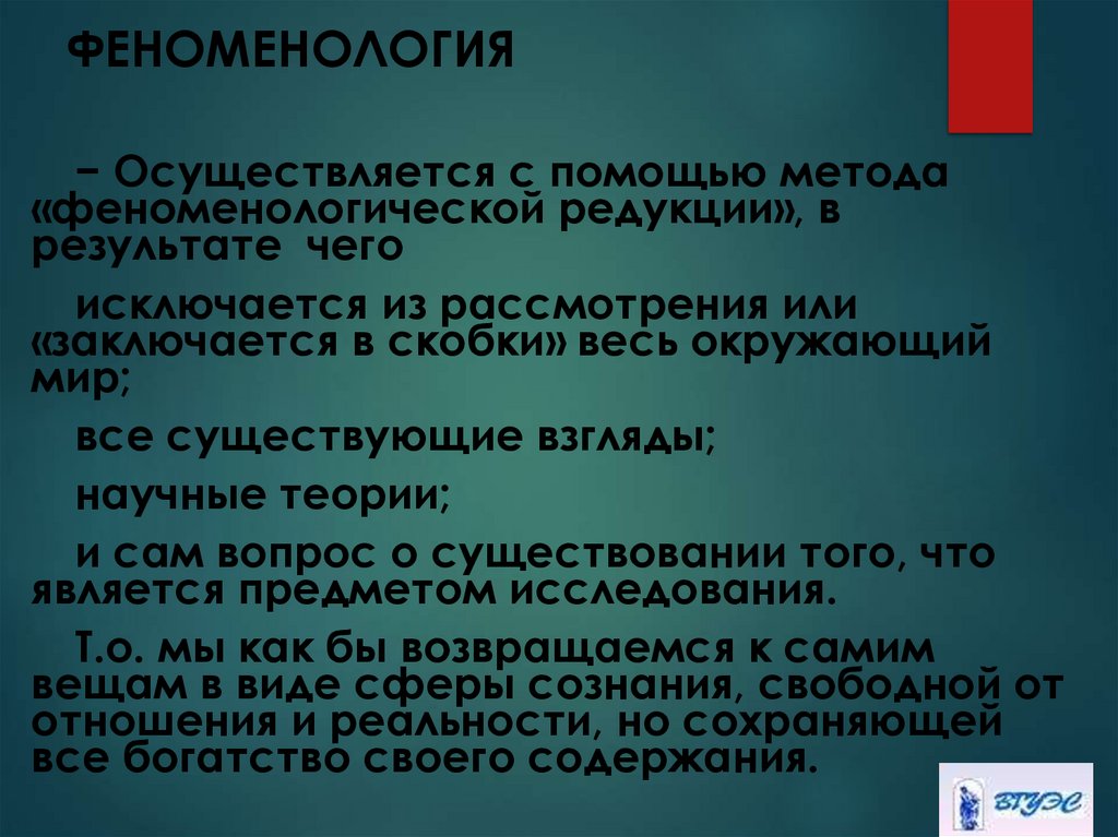 − Осуществляется с помощью метода«феноменологической редукции», в
