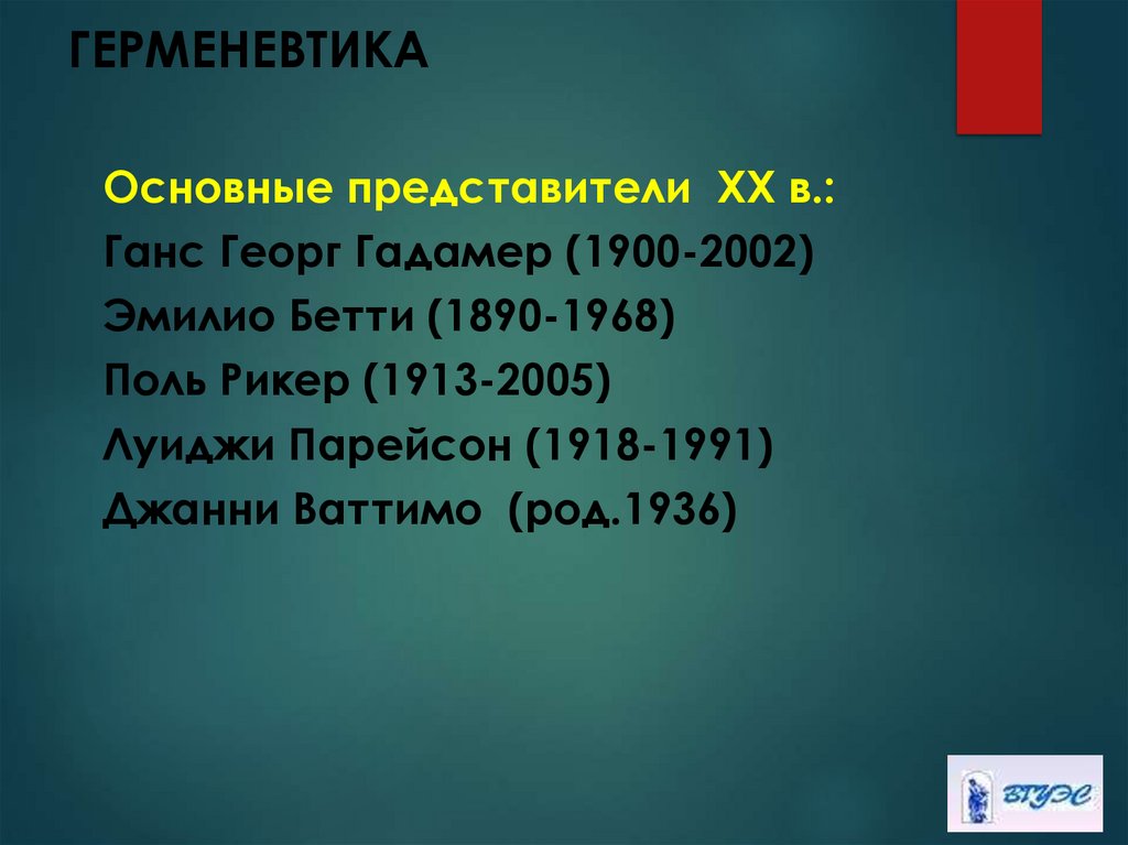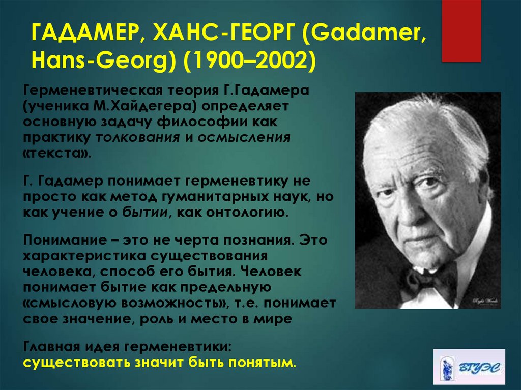 Основные представители ХХ в.:Ганс Георг Гадамер (1900-2002)