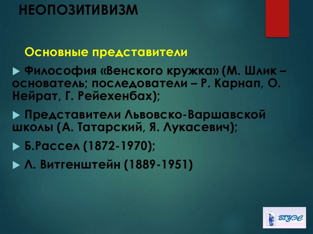 Основные представителиФилософия «Венского кружка» (М. Шлик –